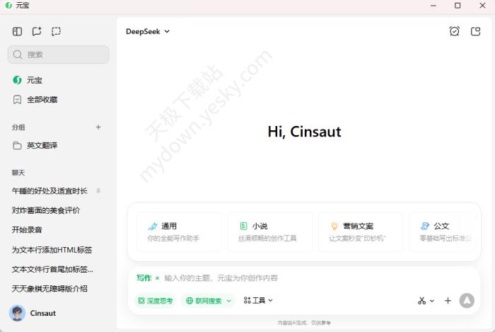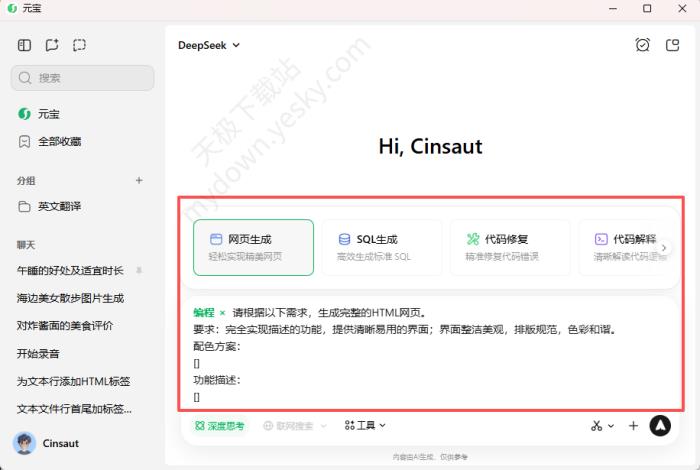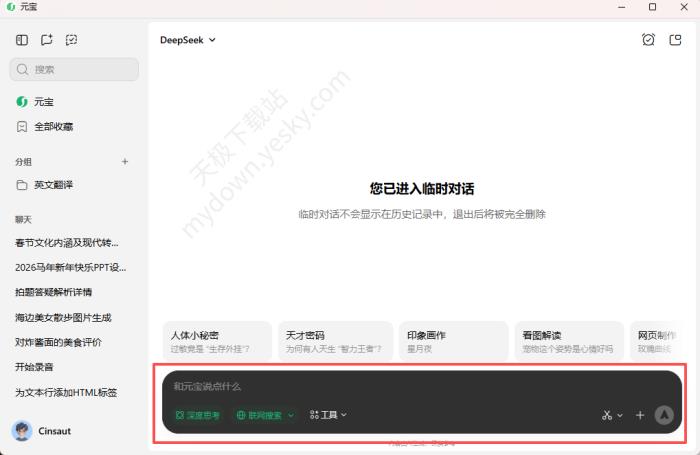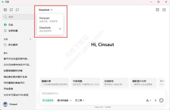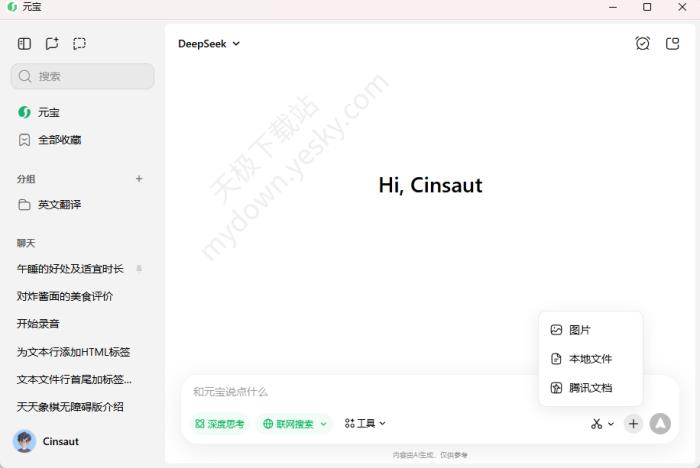 ●元宝:支持深度思考、联网搜索、工具、截图提问,上传文件使用。