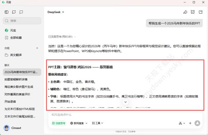 ○元宝主要提供PPT文本大纲,不能直接生成带设计的PPT文件。