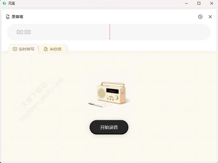 ●录音笔:元宝内置录音笔功能,直接点击开始录音,同时还支持实时转写和AI总结。