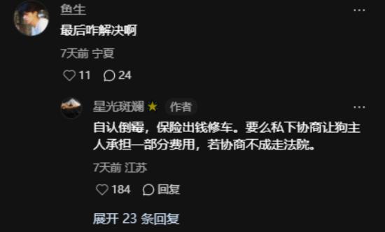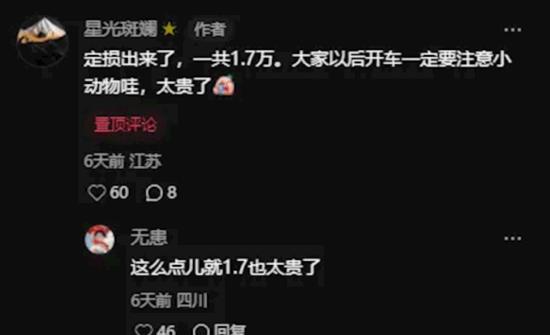 大概两天后,车主透露,定损一共1.7万元,太贵了;后续只能让保险掏钱修车,或者找狗主人协商,承担一部分费用。若协商不成只能走法院起诉。