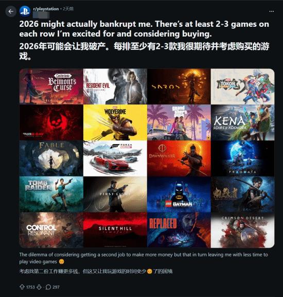 最近,Reddit上有个帖子火了,主题是“2026年大作太多,我可能要破产”,引来了不少网友围观,现在已经有两百多人在下面留言讨论。看样子,大家都觉得2026年游戏阵容豪华到让人吃不消。