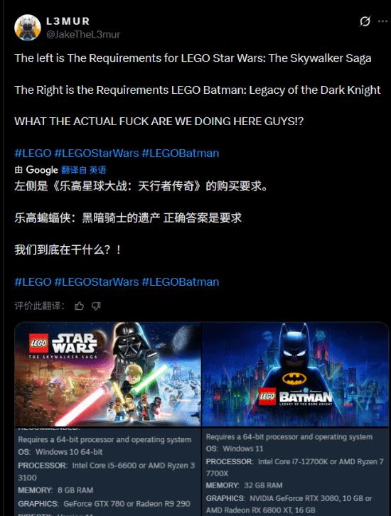 据悉,1月17日首次曝光时,《乐高蝙蝠侠》的配置需求就引发热议。玩家很快将其与2022年的《乐高星球大战:天行者传奇》作对比——后者推荐内存仅为8GB。而短短几年间,TT Games的新作推荐内存却翻了四倍。这也立刻被质疑为PC游戏“优化不足”的又一案例。