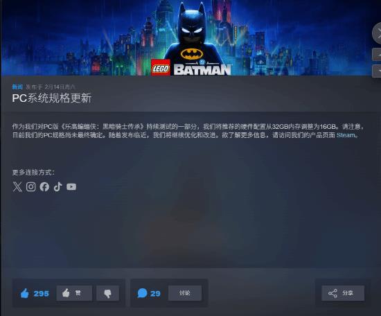 开发商在2月14日的最新公告写道:“在对《乐高蝙蝠侠:黑暗骑士遗产》PC版本进行持续测试的过程中,我们已将推荐硬件配置中的内存要求从32GB下调至16GB。需要注意的是,目前公布的PC配置仍非最终版本,我们将在临近发售前继续进行优化和改进。”
