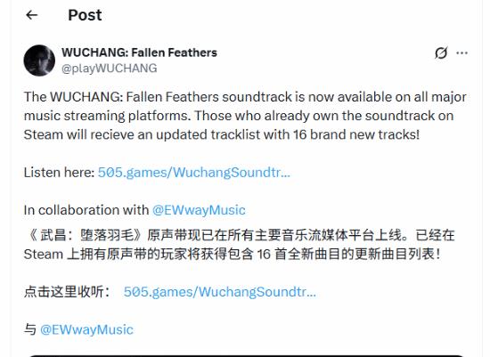 灵泽科技开发、505 Games发行的类魂ARPG游戏《明末:渊虚之羽》官方音乐原声带已经上线,由国内知名音频团队8082Audio制作,目前已登陆YouTube、Apple Music等平台。此前在Steam上已拥有原声带的玩家,还能获得新增16首曲目的更新列表。