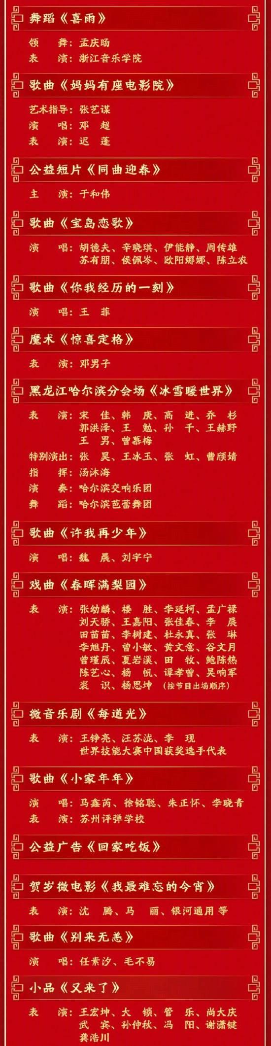 王菲献唱《你我经历的一刻》,时隔多年再登春晚舞台;周深独唱《吉量》,由贵州黔东南“村超”表演队伴舞;郭富城、王一博唱跳《闪耀动起来》,跨代舞王合作舞台。
