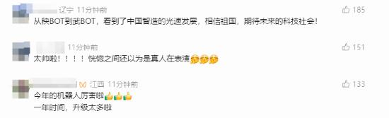 节目播出后迅速引发网友热议,有观众感叹:“恍惚之间还以为是真人在表演。”“比去年玩手绢难太多!空翻对打毫不含糊,大个子机器人舞剑更是稳,跟真人配合得严丝合缝。”