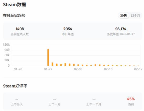 起初,《巅峰守卫》凭借不错的前期观感吸引了不少关注,Steam峰值同时在线人数一度达到9.7万人。然而如今仅剩略高于1000名玩家在线。评价方面同样不乐观。在约3.8万条评测中,超过2.1万条为差评。有玩家表示,游戏本身“还算可以”,但缺乏足够鲜明的特色来脱颖而出。