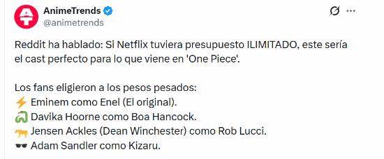 外媒消息,海外社交平台Reddit上,大量《海贼王》粉丝讨论出一份 “无限预算版” 真人剧演员名单,多位知名艺人被提名,随即引发网友激烈争论。