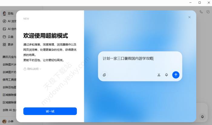 2、看到对话框左下角有【超能模式Beta】的提示就是进入超能模式了,可以直接向豆包提问了。