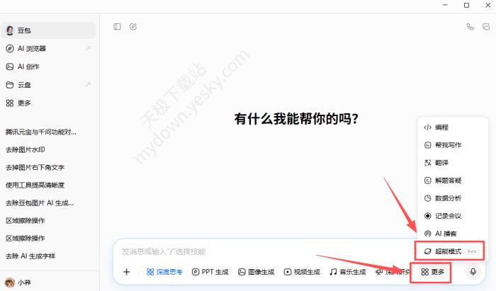 1、打开豆包最新电脑版,点击下方对话框中的【更多】,接着选择【超能模式Beta】。