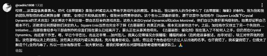 尽管整体基调偏向悲观,发言者仍表示希望自己判断失误,并期待系列能够迎来转机。不过,截至目前,发言账号真实性尚未得到确认,Crystal Dynamics方面也未对上述言论作出回应。