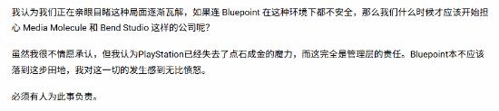 文章最后,作者表达了对PS Studios整体管理状况的担忧。他认为,PlayStation曾以对第一方工作室的精细化管理著称,但如今这种优势正在消失。如果连Bluepoint都无法在当前环境下存续,那么Media Molecule和Bend Studio等工作室的未来是否也值得担忧?