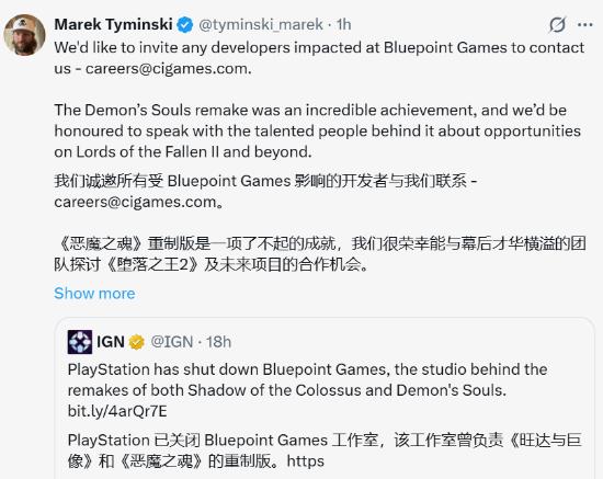 索尼互动娱乐决定在3月关闭蓝点工作室,这让大约70名员工受到影响。就在同一天,《堕落之主2》的开发商CI Games的创始人Marek赶紧向这些受影响的开发者发出邀请,希望他们能加入他们的团队。