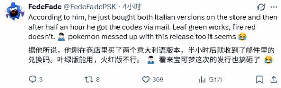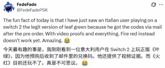 据介绍,一位意大利玩家分享了他在Switch 2上游玩正版《宝可梦 叶绿》的视频,而且是完全合法的版本,他在预购了《宝可梦 火红/叶绿》之后,大概半个小时后就通过邮件收到了兑换码。《宝可梦 叶绿》可以正常游玩,但《宝可梦 火红》不行。“看起来,宝可梦这次发售似乎也出了点岔子。”