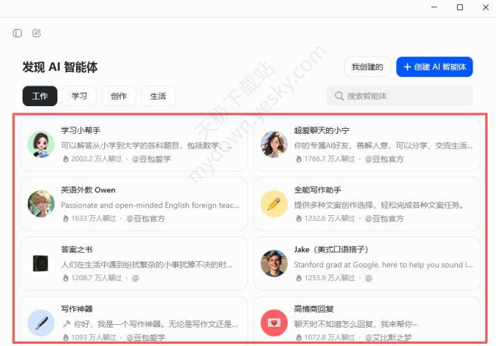 3、在左上角可以区分智能体分类,右上角可以搜索想要使用的智能体。