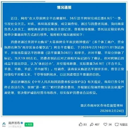 36斤活羊烤后仅剩6.9斤,官方通报商家退一赔三