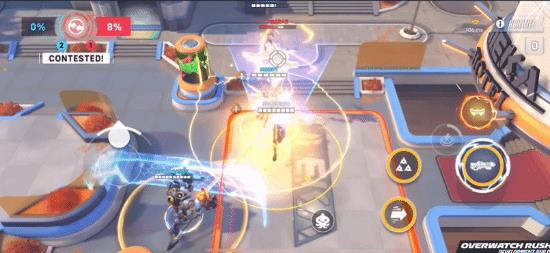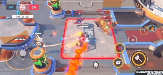 这是一款名为《Overwatch Rush》(守望先锋:冲锋)的 4v4 免费俯视角射击游戏,专为移动端玩家量身打造。