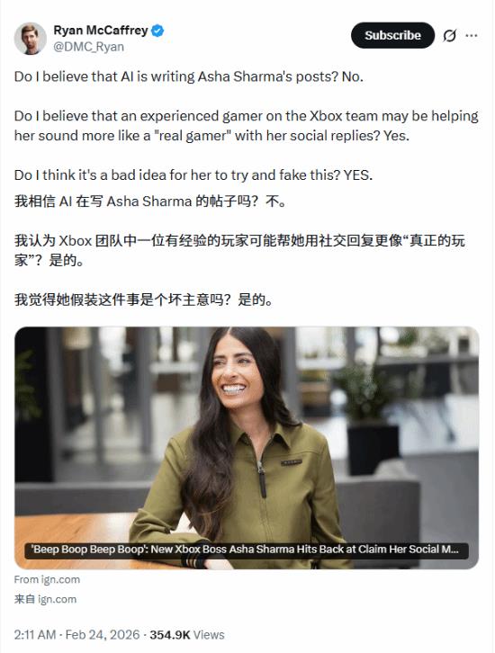 对于有担忧称她此前任职的微软人工智能(AI)部门在为她代写帖子,她也作出了回应,称她认同那些认为伪造对游戏的热爱是件坏事的人。