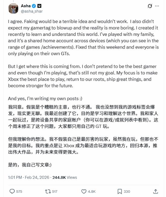 “我也没想到我的游戏账号名会爆火,事实其实更无聊。我最近创建这个账号是为了学习和了解这个领域。我和家人一起玩游戏,这是一个跨设备的家庭共享账号(从游戏/成就的范围就能看出来)。这个周末我已经解决了这个问题,现在每个人都只用自己的游戏账号名玩了。”她说完后再次强调,她的目标是回归Xbox的本源,让这个品牌在未来变得更强大。