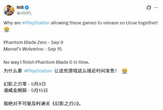 博主@nib95_在社交平台发文哀叹:“为什么索尼允许这两款游戏发售得如此接近!😭”根据目前的定档信息,《影之刃零》将于9月9日发售,而《漫威金刚狼》紧随其后定于9月15日。这意味着留给玩家攻略《影之刃零》的时间只有不到一周,博主直言:“我绝无可能在这么短时间内通关《影之刃零》。”