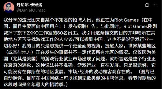 此外,他还提到,拳头公司近期裁撤了约80名参与《2XKO》项目的员工,但与此同时,该公司在中国地区仍有多个岗位持续开放招聘。