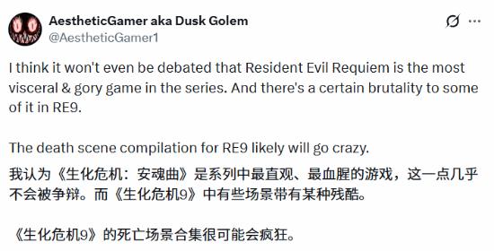 DuskGolem在推文中直言不讳地表示:“我认为《生化危机9:安魂曲》是系列中最具视觉冲击力、最血腥的一作,这一点甚至无需争论。在RE9中,某些内容展现出了一种特定的残暴感。可以预见,RE9的死亡场景合集到时候绝对会引发疯狂。”