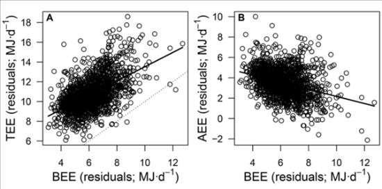 总能量消耗(TEE)与基础能量消耗(BEE)成正比,而日常活动的能量消耗(AEE)却与基础能量消耗成反比。