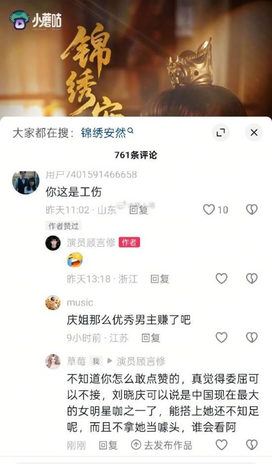 据悉,《锦绣安然》上线后,刘晓庆“71岁饰演少女”的设定的以及与金珈的年龄差吻戏,迅速引发网友广泛讨论,不同观点激烈碰撞。期间,有网友发布评论调侃“与71岁刘晓庆搭戏是工伤”,该评论在社交平台逐渐流传,随后有网友发现,该剧男配角顾言修点赞了这条争议评论。