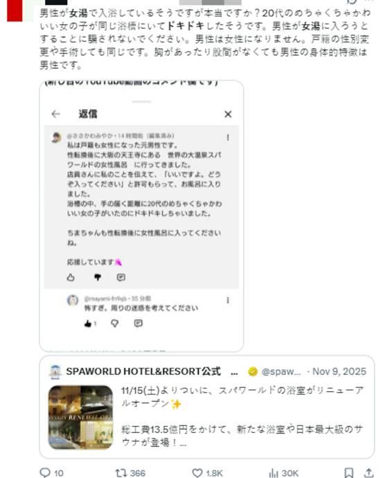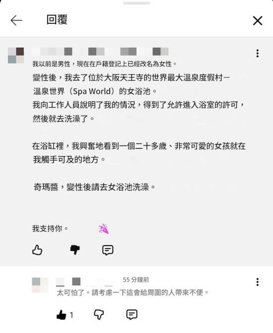 大量日本网民表示强烈不适:“如果仍对女性有性冲动,就不该进女浴池。”该评论获近两万点赞。