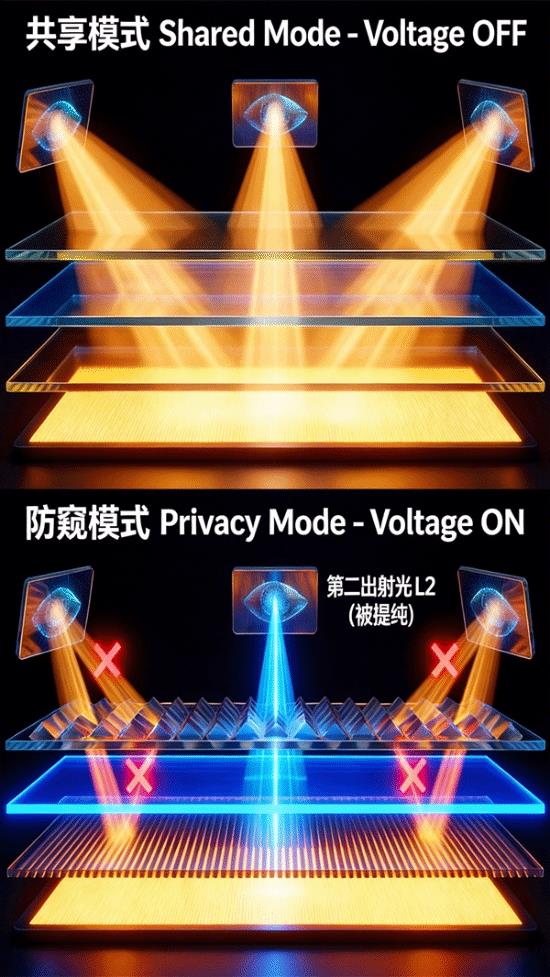 与传统的防窥膜完全不同,硬件级防窥屏是从显示底层来解决隐私问题。当用户开启防窥模式后,屏幕的折射率会发生改变。此时,第一折射层表面雕刻的微观光栅会瞬间化身为一道道微观的百叶窗,强行改变那些大角度向外折射的光线。