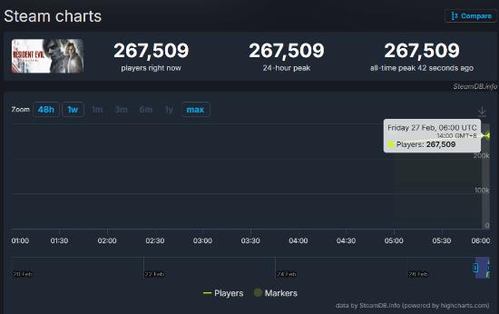 《生化危机9:安魂曲》主机版昨天刚解禁,今天Steam一开放,就火速刷新了《生化危机》系列的在线人数纪录,短短一小时就吸引了26.7万玩家同时在线。