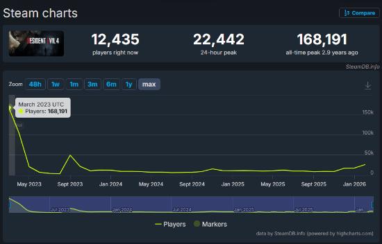 而作为对比,上一部《生化危机》,也就是《生化危机4重制版》的Steam最高同时游玩人数仅有16.8万人,此外《生化危机8》最高仅有10.6万人。