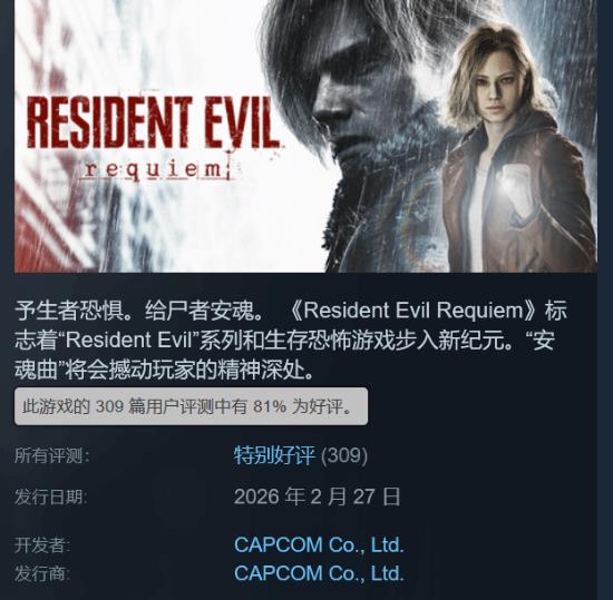 《生化危机9:安魂曲》是卡普空推出的《生化危机》系列新作,2月27日正式上线,适用于PC、PS5、Switch2和XSX平台,在国区Steam上评价褒贬不一,优化和手柄适配问题引发玩家关注。