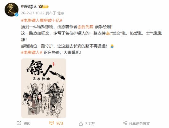 就在刚刚,《镖人:风起大漠》的票房已正式突破10亿!官方发布了一张由原著作者许先哲绘制的贺图。