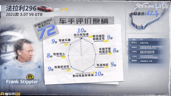 法拉利296则在驾驶乐趣、驾驶信心、驾乘舒适性、弯道响应、车辆平衡和稳定性以及转向操控和稳定性方面略逊一筹,拿下了72分的评价。