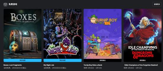 Epic游戏商城本周的免费游戏已经可以领取啦!这次有《Boxes: Lost Fragments》和《我的夜间工作》两款,玩家可以在2月27日到3月6日之间入手。下周要是你有兴趣,《Turnip Boy Robs a Bank》和《遗忘国度之闲置冠军》将从3月6日到3月13日免费开放领取。别错过机会!