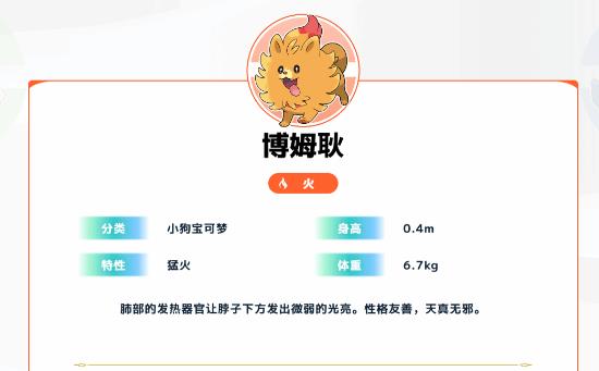 火系御三家博姆耿属于小狗宝可梦,身高0.4m,体重6.7kg,特性为“猛火”,其肺部的发热器官会让脖子下方发出微弱光亮,性格友善且天真无邪,软萌的外形与温顺的性格,有望成为人气较高的御三家选择。