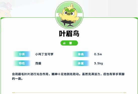草系御三家叶眉鸟为小鸡丁宝可梦,身高0.3m,体重3.5kg,特性为“茂盛”,独特的眉毛叶片可进行光合作用,让它始终精神十足、四处跑动,虽充满活力,但也有着笨手笨脚的可爱一面,完美契合草系宝可梦的灵动特质。