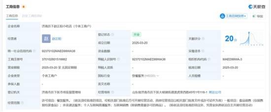 天眼查公开信息显示,涉事店铺的登记名称为济南历下赵正阳小吃店,属于个体工商户,经营者为赵正阳,其经营范围涵盖了餐饮服务、外卖递送以及互联网销售等多个领域。