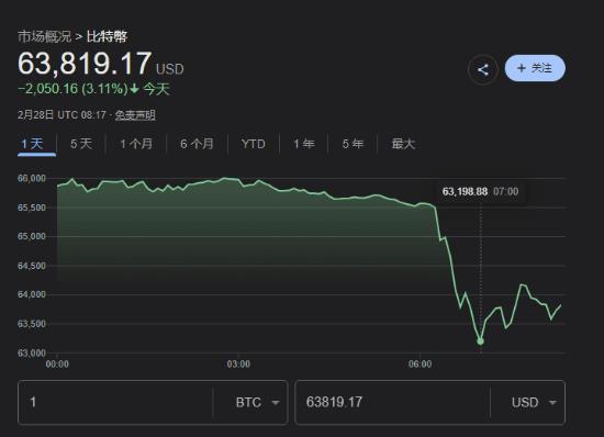 据新浪财经报道,2月28日,加密货币市场经历了一场大“洗礼”,因为地缘冲突和市场恐慌的共同作用,比特币价格急剧下跌,一度跌破63500美元。