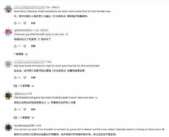 《生化危机 9》的死亡动画设计极具冲击力,有网友表示: 比《生化危机 4》重制版更加血腥。玩家评论中提到,从肩膀劈开到腹部的场景,以及电锯处决的暴力表现,远超系列前作,部分玩家直言 “这是我见过最有创意的死亡场景”,也有玩家认为 “暴力程度过于直白,可能引发不适”。