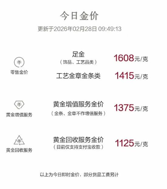2月28日,零售金店金价全线跳涨。老铺黄金启动年内首轮调价,涨幅高达30%。多家品牌金店金饰报价突破1600元/克,较上一日涨超30元/克。