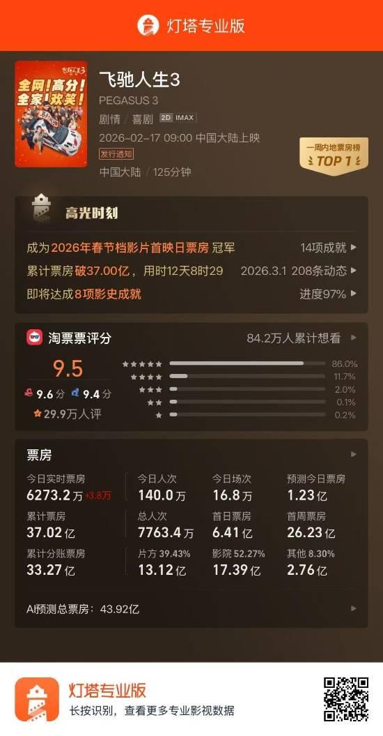 据灯塔专业版,截至2月28日,影片《飞驰人生3》累计票房37.02亿,用时12天8时。