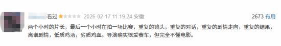 在豆瓣,给出差评的观众一针见血:“两个小时的片长,最后一个小时在拍一场比赛,重复的镜头,重复的对话,重复的剧情走向,重复的结果,离谱剧情,低质鸡汤,劣质鸡血。导演确实很爱赛车,但完全不懂电影。”