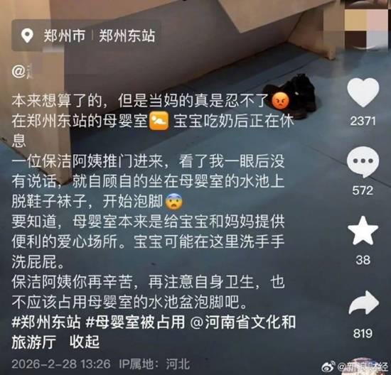 网传视频显示,在一间母婴室里,有高低两个水池,一名保洁员坐在较高的水池台面上,用较低的水池洗脚。 该网友在视频配文和评论里介绍,事发郑州东站二楼候车大厅母婴室,她喂完奶休息时,一名保洁员进来后自顾自地开始洗脚。“要知道,母婴室本来是给宝宝和妈妈提供便利的爱心场所。宝宝可能在这里洗手手、洗屁屁。”该网友写道,“就算她偷偷这样,我都能理解。看到我们在,还明目张胆,是不是无语?”