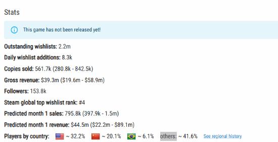另一家专注Steam数据分析的平台Gamalytic则给出更为细致的预估:当前总销量约56.17万份(预估区间28.08万–84.25万),当前收入约3930万美元(区间1960万–5890万);