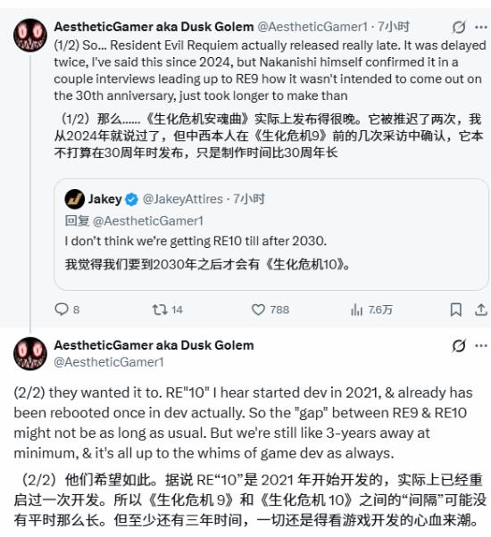 针对玩家关心的《生化危机 10》(RE10),AestheticGamer 表示,该作早在 2021 年就已启动开发,但在开发过程中已经重启过一次。这意味着 RE9 与 RE10 之间的间隔可能不会像以往系列作品那样漫长。不过,他同时指出,RE10 至少还需要三年时间才能与玩家见面,具体发售时间仍取决于开发团队的进度。