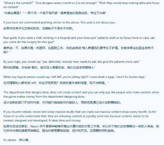 由于部分玩家抱怨游戏更新节奏缓慢、一两个月才出一个新副本,且质疑官方“只顾卖皮肤不顾做内容”,一名愤怒的玩家发长文回击。