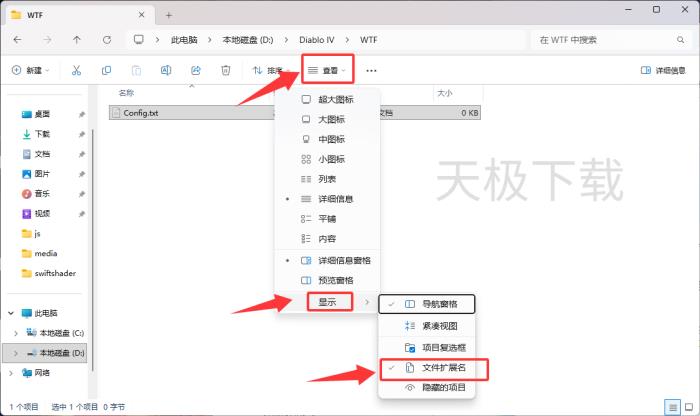 4.点击上方的【查看】-【显示】,勾选【文件扩展名】。