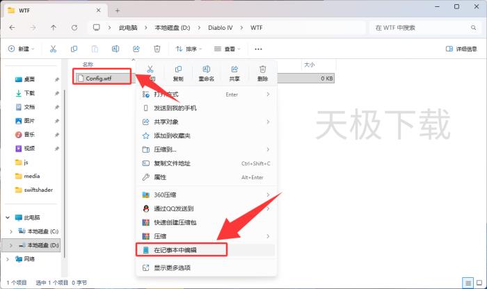 5.将原先的【Config.txt】改成【Config.wtf】,并选中文件右键,选择【在记事本中编辑】。
